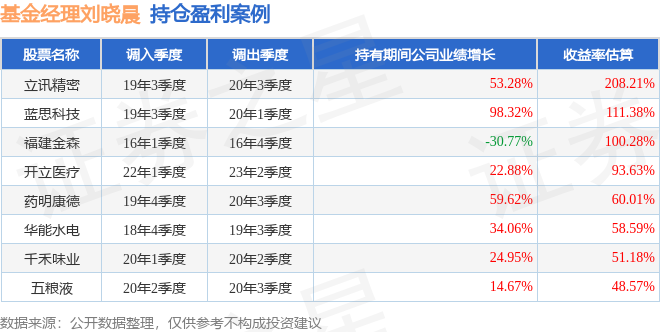 刘晓晨管理的新华战略新兴产业灵活配置混合基金在19年3季度买入立讯精密,在持有1年又0个季度后在20年3季度卖出。持有期间的估算收益率为208.21%,持有期间立讯精密在2019年到2020年的年报归属净利润增幅达53.28%。