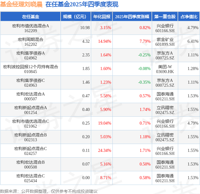 证券之星消息,截止2025年四季度末,基金经理刘晓晨旗下共管理12只基金,本季度表现最佳的为宏利周期混合(162202),季度净值涨7.79%。