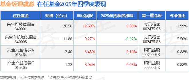 证券之星消息,截止2025年四季度末,基金经理虞淼旗下共管理4只基金,本季度表现最佳的为兴全兴益债券A(015464),季度净值涨0.19%。