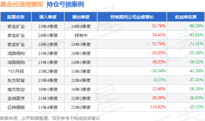 周雪军管理的海富通改革驱动混合基金在23年4季度买入紫金矿业,在持有1年又0个季度后在24年4季度卖出。持有期间的估算收益率为-86.5%,持有期间紫金矿业在2023年到2024年的年报归属净利润增幅达51.76%。