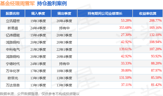 周雪军管理的海富通收益增长混合基金在19年3季度买入立讯精密,在持有1年又1个季度后在20年4季度卖出。持有期间的估算收益率为208.77%,持有期间立讯精密在2019年到2020年的年报归属净利润增幅达53.28%。