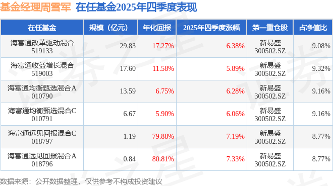 证券之星消息,截止2025年四季度末,基金经理周雪军旗下共管理6只基金,本季度表现最佳的为海富通远见回报混合A(018796),季度净值涨7.33%。