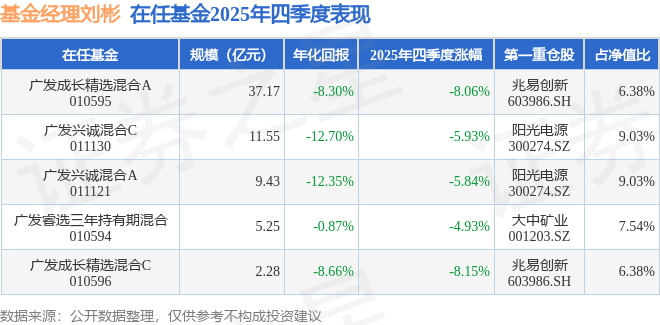 证券之星消息,截止2025年四季度末,基金经理刘彬旗下共管理5只基金,本季度表现最佳的为广发睿选三年持有期混合(010594),季度净值跌4.93%。