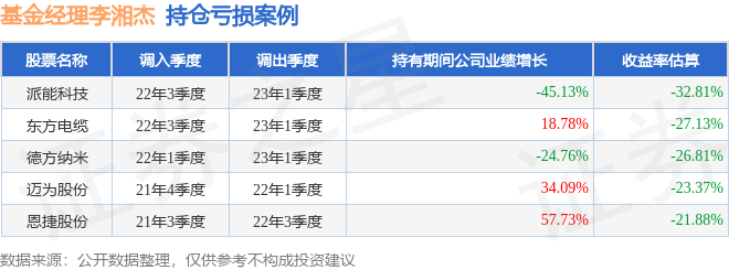李湘杰管理的华夏优势精选股票基金在22年3季度买入派能科技,在持有2个季度后在23年1季度卖出。持有期间的估算收益率为-32.82%,持有期间派能科技在2022年到2023年的年报营业总收入降幅为45.13%。