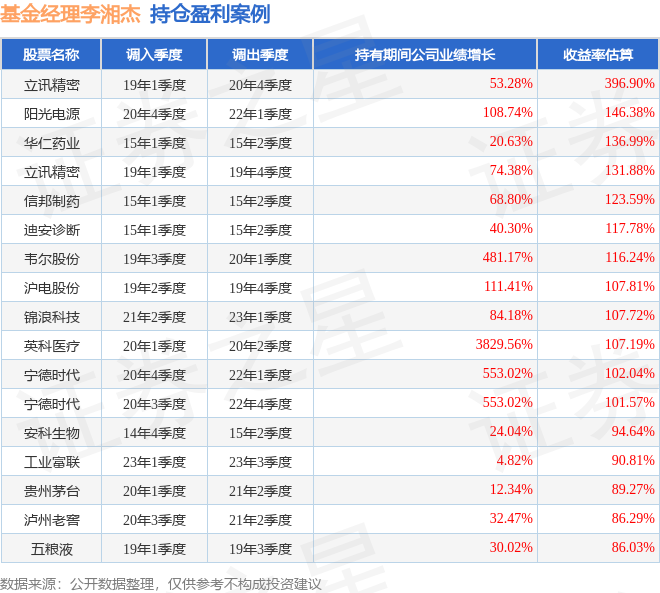 李湘杰管理的华夏优势精选股票基金在19年1季度买入立讯精密,在持有1年又3个季度后在20年4季度卖出。持有期间的估算收益率为396.9%,持有期间立讯精密在2019年到2020年的年报归属净利润增幅达53.28%。