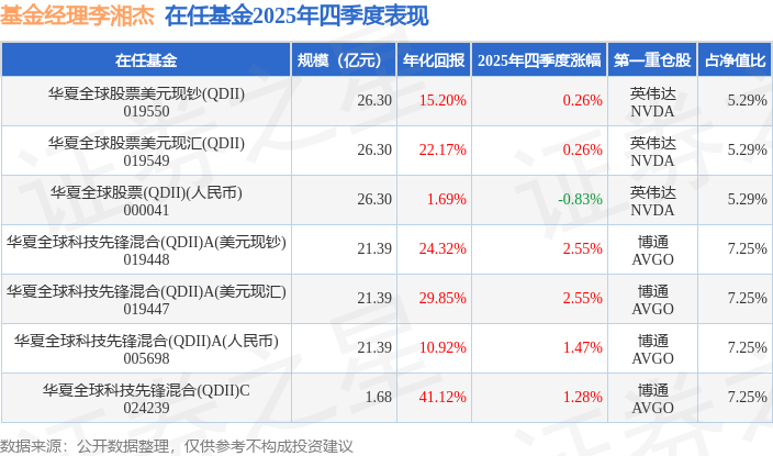 证券之星消息,截止2025年四季度末,基金经理李湘杰旗下共管理7只基金,本季度表现最佳的为华夏全球科技先锋混合(QDII)A(美元现钞)(019448),季度净值涨2.55%。