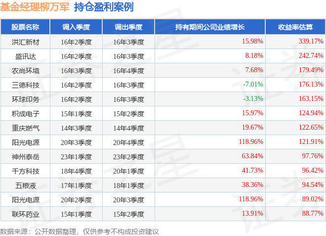 柳万军管理的华夏新机遇混合A基金在16年2季度买入洪汇新材,在持有1个季度后在16年3季度卖出。持有期间的估算收益率为339.17%,持有期间洪汇新材在2015年到2016年的年报归属净利润增幅达15.98%。