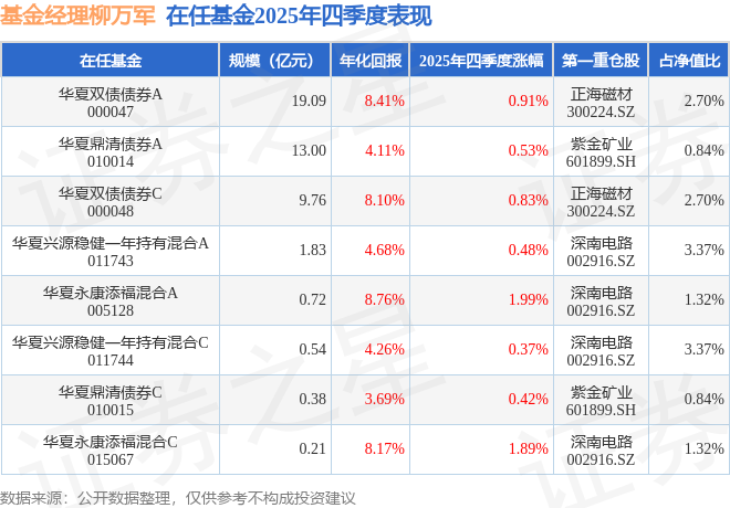 证券之星消息,截止2025年四季度末,基金经理柳万军旗下共管理8只基金,本季度表现最佳的为华夏永康添福混合A(005128),季度净值涨1.99%。