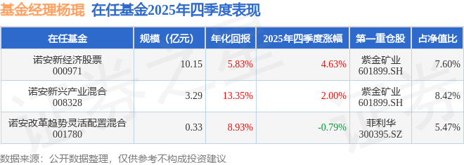 证券之星消息,截止2025年四季度末,基金经理杨琨旗下共管理3只基金,本季度表现最佳的为诺安新经济股票(000971),季度净值涨4.63%。