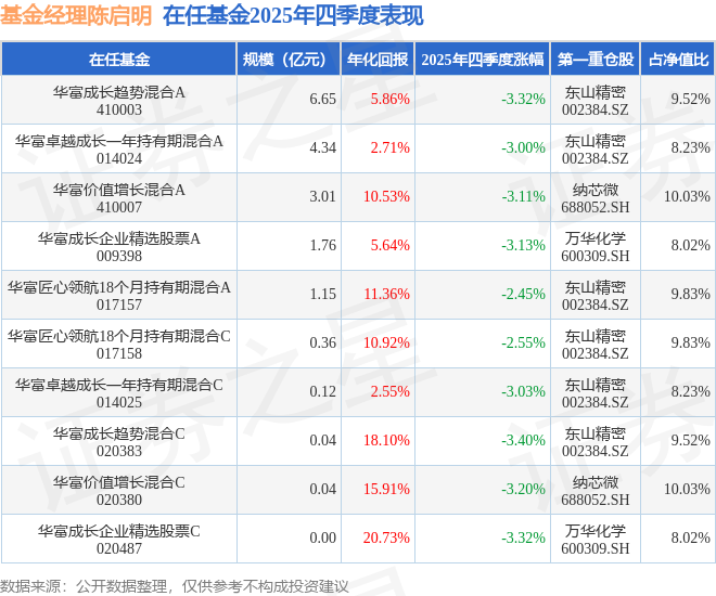 证券之星消息,截止2025年四季度末,基金经理陈启明旗下共管理10只基金,本季度表现最佳的为华富匠心领航18个月持有期混合A(017157),季度净值跌2.45%。