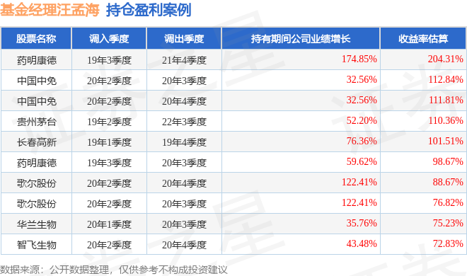 汪孟海管理的富国沪港深价值混合A基金在19年3季度买入药明康德,在持有2年又1个季度后在21年4季度卖出。持有期间的估算收益率为204.31%,持有期间药明康德在2019年到2021年的年报归属净利润增幅达174.85%。