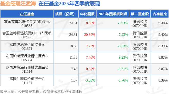 证券之星消息,截止2025年四季度末,基金经理汪孟海旗下共管理6只基金,本季度表现最佳的为富国沪港深价值混合A(001371),季度净值跌6.63%。
