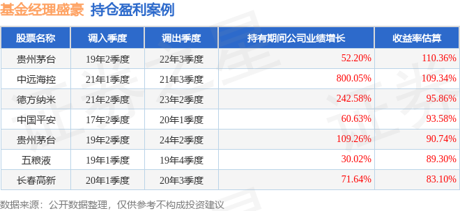 盛豪管理的华泰柏瑞量化明选A基金在19年2季度买入贵州茅台,在持有3年又1个季度后在22年3季度卖出。持有期间的估算收益率为110.36%,持有期间贵州茅台在2019年到2022年的年报归属净利润增幅达52.2%。