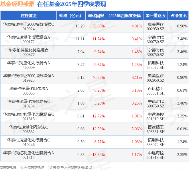 盛豪在担任华泰柏瑞量化优选混合(000877)基金经理的任职期间累计任职回报137.98%,平均年化收益率为8.8%。期间重仓股调仓次数共有170次,其中盈利次数为109次,胜率为64.12%;翻倍级别收益有1次,翻倍率为0.59%。