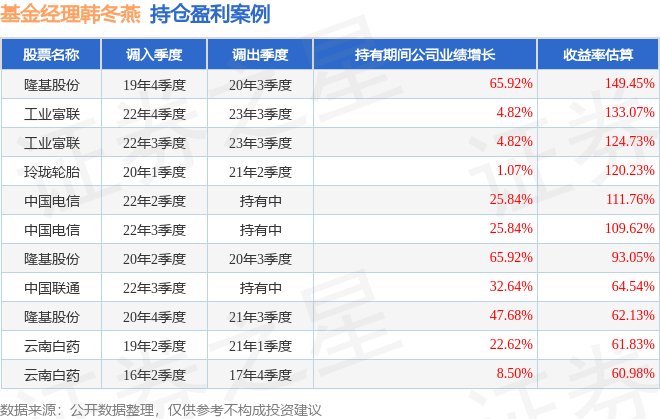 韩冬燕管理的诺安中小盘精选混合A基金在19年4季度买入隆基股份,在持有3个季度后在20年3季度卖出。持有期间的估算收益率为149.45%,持有期间隆基股份在2019年到2020年的年报营业总收入增幅达65.92%。