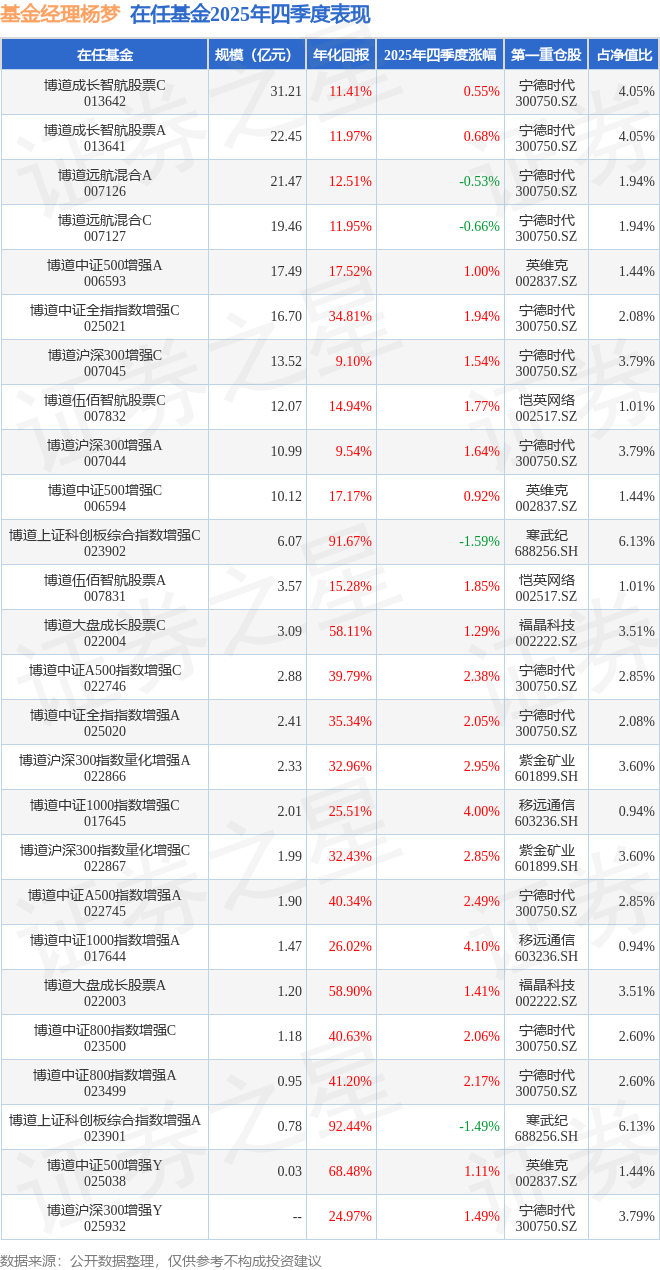 证券之星消息,截止2025年四季度末,基金经理杨梦旗下共管理26只基金,本季度表现最佳的为博道中证1000指数增强A(017644),季度净值涨4.1%。