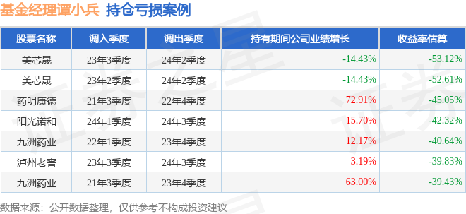 谭小兵管理的长城健康生活混合A基金在23年3季度买入美芯晟,在持有3个季度后在24年2季度卖出。持有期间的估算收益率为-53.12%,持有期间美芯晟在2023年到2024年的年报营业总收入降幅为14.43%。