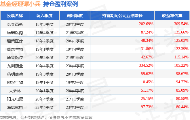 谭小兵管理的长城医疗保健混合A基金在19年3季度买入药明康德,在持有1年又0个季度后在20年3季度卖出。持有期间的估算收益率为98.67%,持有期间药明康德在2019年到2020年的年报归属净利润增幅达59.62%。