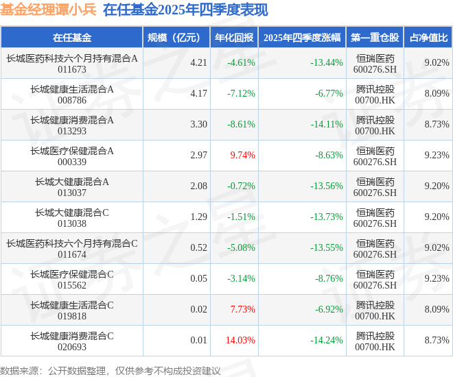 证券之星消息,截止2025年四季度末,基金经理谭小兵旗下共管理10只基金,本季度表现最佳的为长城健康生活混合A(008786),季度净值跌6.77%。