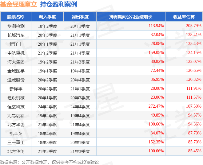 童立管理的华商新锐产业混合基金在18年2季度买入华测检测,在持有1年又3个季度后在20年1季度卖出。持有期间的估算收益率为205.79%,持有期间华测检测在2018年到2020年的年报归属净利润增幅达113.94%。