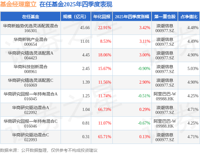 童立管理的华商主题精选混合基金在19年2季度买入兆易创新,在持有2个季度后在19年4季度卖出。持有期间的估算收益率为94.57%,持有期间兆易创新在2018年到2019年的年报归属净利润增幅达49.85%。