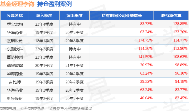 李海管理的国泰金鹿混合基金在20年1季度买入福耀玻璃,在持有1年又0个季度后在21年1季度卖出。持有期间的估算收益率为98.89%,持有期间福耀玻璃在2020年到2021年的年报归属净利润增幅达20.97%。