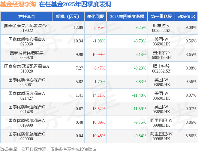 证券之星消息,截止2025年四季度末,基金经理李海旗下共管理9只基金,本季度表现最佳的为国泰消费优选股票(005970),季度净值跌6.14%。