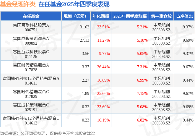 许炎管理的富国互联科技股票A基金在21年2季度买入北方华创,在持有2个季度后在21年4季度卖出。持有期间的估算收益率为94.36%,持有期间北方华创在2020年到2021年的年报归属净利润增幅达100.66%。