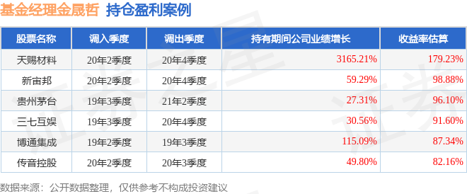 金晟哲管理的博时主题LOF基金在20年2季度买入天赐材料,在持有2个季度后在20年4季度卖出。持有期间的估算收益率为179.23%,持有期间天赐材料在2019年到2020年的年报归属净利润增幅达3165.21%。