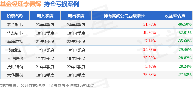 李德辉管理的摩根卓越制造股票A基金在23年4季度买入紫金矿业,在持有1年又0个季度后在24年4季度卖出。持有期间的估算收益率为-86.5%,持有期间紫金矿业在2023年到2024年的年报归属净利润增幅达51.76%。
