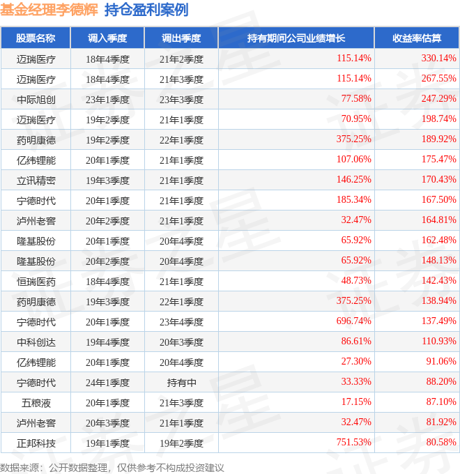 李德辉管理的摩根科技前沿混合A基金在18年4季度买入迈瑞医疗,在持有2年又2个季度后在21年2季度卖出。持有期间的估算收益率为330.14%,持有期间迈瑞医疗在2018年到2021年的年报归属净利润增幅达115.14%。