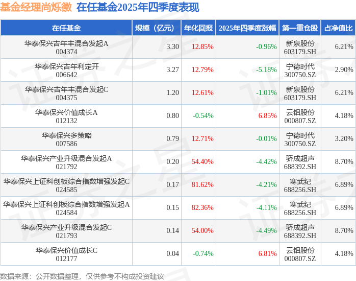 证券之星消息,截止2025年四季度末,基金经理尚烁徽旗下共管理10只基金,本季度表现最佳的为华泰保兴价值成长A(012132),季度净值涨6.85%。