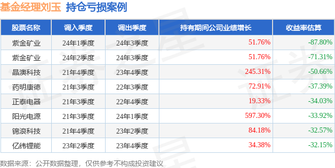 刘玉管理的广发新动力混合A基金在24年1季度买入紫金矿业,在持有2个季度后在24年3季度卖出。持有期间的估算收益率为-87.8%,持有期间紫金矿业在2023年到2024年的年报归属净利润增幅达51.76%。