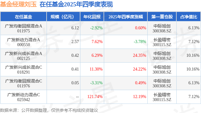 证券之星消息,截止2025年四季度末,基金经理刘玉旗下共管理6只基金,本季度表现最佳的为广发新兴成长混合A(002125),季度净值涨24.35%。