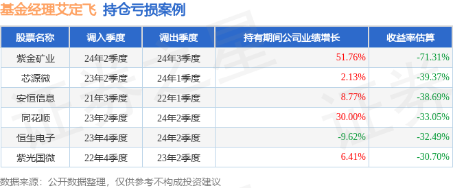 艾定飞管理的华商300智选混合A基金在24年2季度买入紫金矿业,在持有1个季度后在24年3季度卖出。持有期间的估算收益率为-71.31%,持有期间紫金矿业在2023年到2024年的年报归属净利润增幅达51.76%。