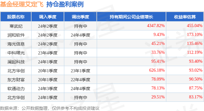 艾定飞管理的华商电子行业量化股票发起式A基金在24年2季度买入寒武纪,已连续持有1年又2个季度。持有期间的估算收益率为455.04%,持有期间寒武纪在2024年到2025年的中报营业总收入增幅达4347.82%。