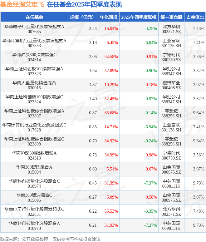 证券之星消息,截止2025年四季度末,基金经理艾定飞旗下共管理15只基金,本季度表现最佳的为华商沪深300指数增强A(024313),季度净值涨0.98%。