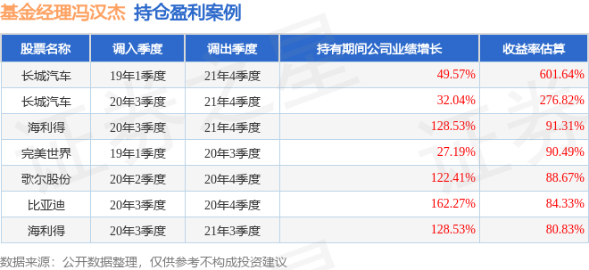 冯汉杰管理的中加转型动力混合A基金在19年1季度买入长城汽车,在持有2年又3个季度后在21年4季度卖出。持有期间的估算收益率为601.64%,持有期间长城汽车在2019年到2021年的年报归属净利润增幅达49.57%。