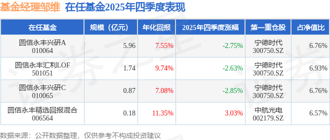 证券之星消息,截止2025年四季度末,基金经理邹维旗下共管理4只基金,本季度表现最佳的为圆信永丰精选回报混合(006564),季度净值涨3.03%。