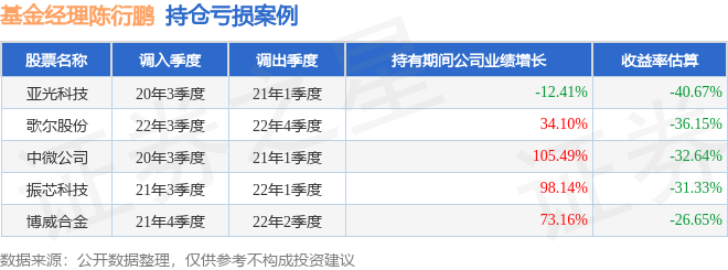 陈衍鹏管理的诺安益鑫灵活配置混合A基金在20年3季度买入亚光科技,在持有2个季度后在21年1季度卖出。持有期间的估算收益率为-40.67%,持有期间亚光科技在2020年到2021年的年报营业总收入降幅为12.41%。