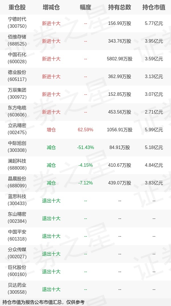 证券之星消息,1月22日兴证全球基金旗下乔迁管理的兴全新视野灵活配置定期开放混合型发起式基金公布年报,近1年净值增长率41.6%。与上一季度相比,该基金前十大重仓股新增宁德时代,佰维存储,中国石化,德业股份,万辰集团,东方电缆;并对立讯精密增仓406.87万股,为该基金第一大重仓股;蓝思科技,东山精密,中国平安,分众传媒,巨化股份,贝达药业等退出前十大重仓股;详细数据如下: