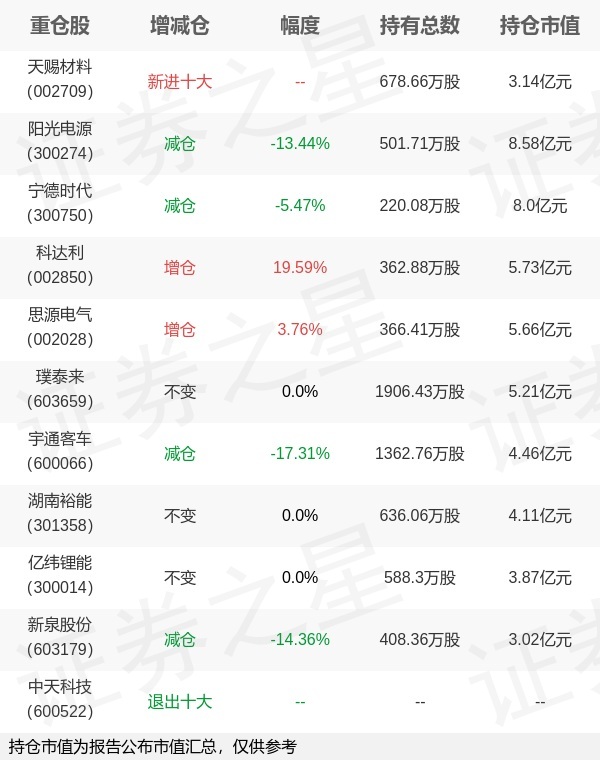证券之星消息,1月22日华夏基金旗下杨宇管理的华夏能源革新股票型基金公布年报,近1年净值增长率45.19%。与上一季度相比,该基金前十大重仓股新增天赐材料;其中阳光电源持仓占比9.51%,为该基金第一大重仓股;中天科技等退出前十大重仓股;详细数据如下: