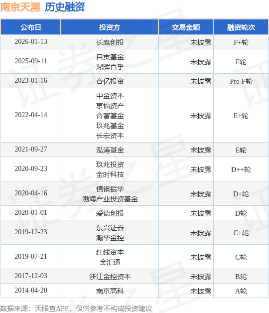 证券之星消息,根据天眼查APP于1月13日公布的信息整理,南京天溯自动化控制系统有限公司F+轮融资,融资额未披露,参与投资的机构包括长鹰创投。