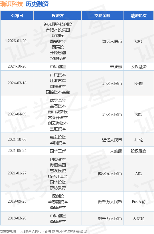 证券之星消息,根据天眼查APP于1月20日公布的信息整理,深圳瑞识智能科技有限公司C轮融资,融资额数亿人民币,参与投资的机构包括追光硬科技创投,合肥产投集团,深创投,西安财金,西高投,开源思创,农银投资。