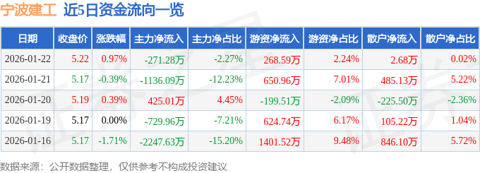 证券之星消息,截至2026年1月22日收盘,宁波建工(601789)报收于5.22元,上涨0.97%,换手率2.12%,成交量23.05万手,成交额1.2亿元。