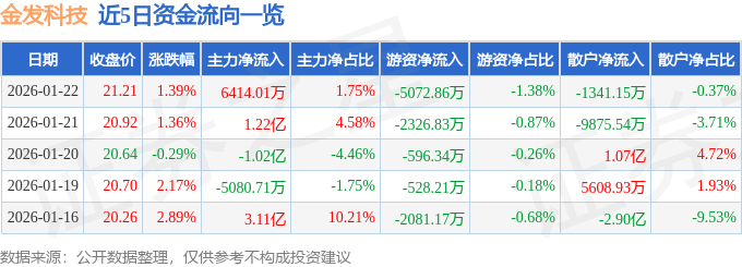 证券之星消息,截至2026年1月22日收盘,金发科技(600143)报收于21.21元,上涨1.39%,换手率6.51%,成交量171.41万手,成交额36.67亿元。