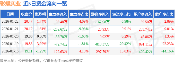 证券之星消息,截至2026年1月22日收盘,彩蝶实业(603073)报收于20.47元,上涨1.74%,换手率2.32%,成交量1.18万手,成交额2405.76万元。