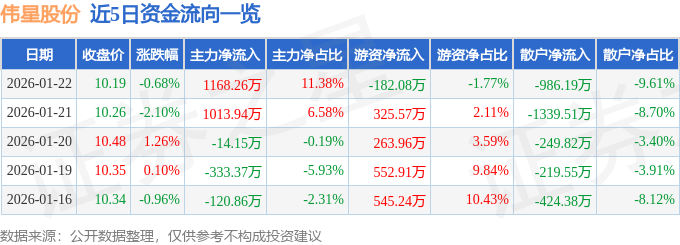 证券之星消息,截至2026年1月22日收盘,伟星股份(002003)报收于10.19元,下跌0.68%,换手率0.98%,成交量10.06万手,成交额1.03亿元。