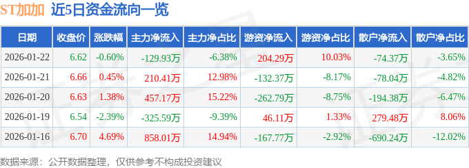 证券之星消息,截至2026年1月22日收盘,ST加加(002650)报收于6.62元,下跌0.6%,换手率0.28%,成交量3.07万手,成交额2036.54万元。