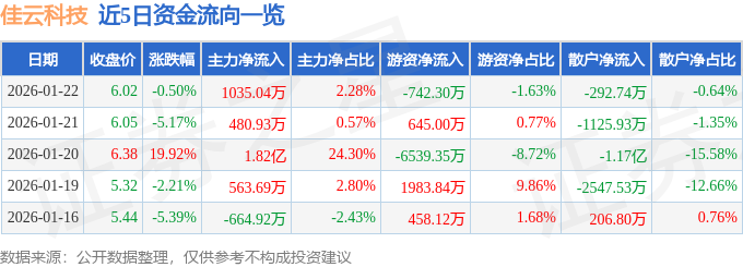 证券之星消息,截至2026年1月22日收盘,佳云科技(300242)报收于6.02元,下跌0.5%,换手率11.95%,成交量75.85万手,成交额4.55亿元。